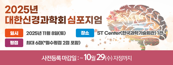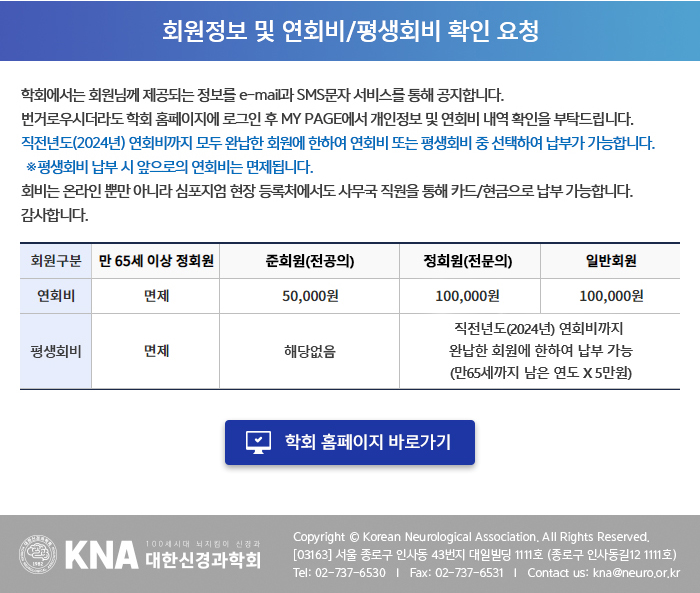 국민에게 받고, 회원에게 받는 신경과! 국민의 뇌 건강 증진에 기여하고, 회원의 권익 향상 도모를 목적으로 한다. 1 2 JKNA Homepage JCN Homepage 연간일정 대한신경과학회 및 연관학회의 행사일정을 안내드립니다. 더보기→ 공지사항 더보기 + [대한의사협회] 2025년 심사 재점검 관련 안내(눈의 계측검사 산정횟수 점검 추가) [대한의사협회] 상병마스터 부가정보(법정감염구분)업데이트 반영 정정사항 안내 [대한신경과학회 회원님께] [수면다원검사 정도관리위원회] 수면다원검사 교육이수자에 대한 자격 갱신 변경 관련 안내 [대한의사협회] 「척수신경말초지차단술」 자율점검 운영 안내 [대한의사협회] 회비납부율 제고를 위한 회원 대상 회비 납부 독려 협조 요청
