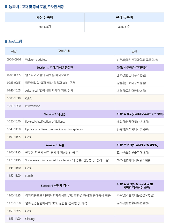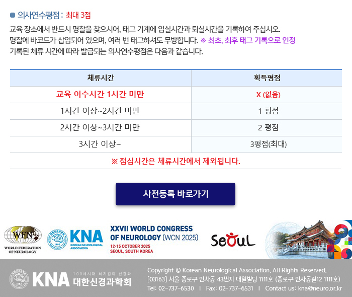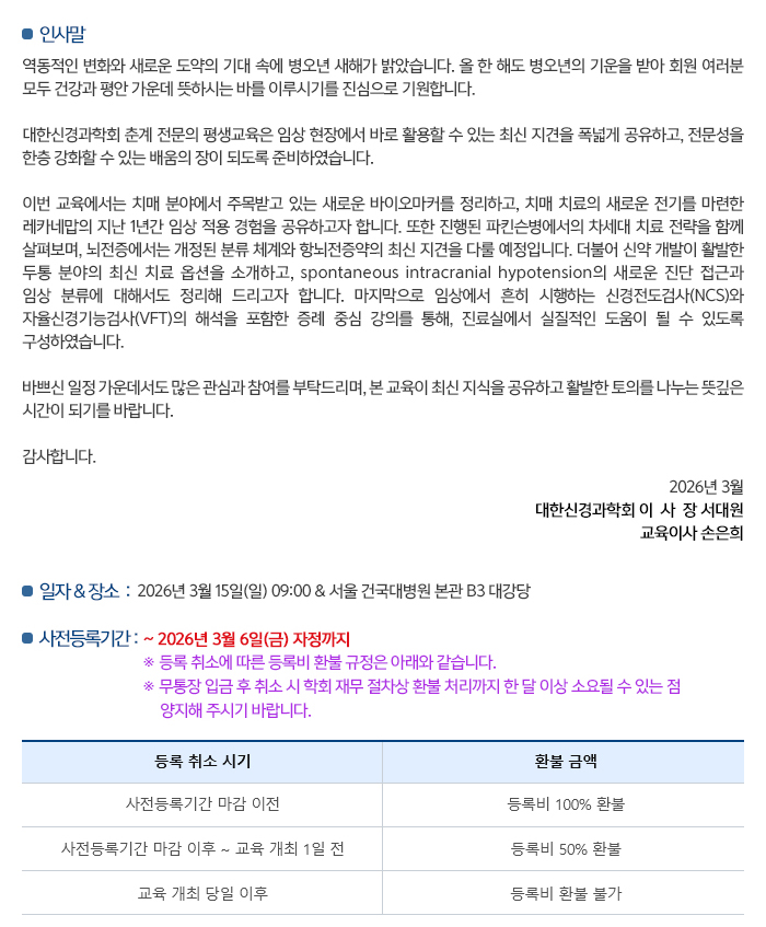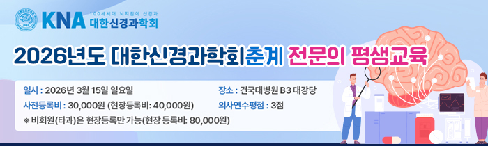 국내 2026년 대한신경과학회 춘계 전문의 평생교육 일자 : 03.15 (일) 장소 : 서울 건국대병원 B3 대강당 Homepage : https://new.neuro.or.kr/workshop/education/lifelong/202601/?sn=3 목록