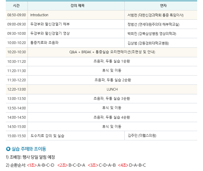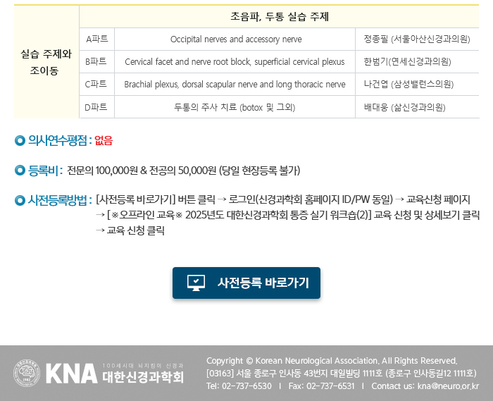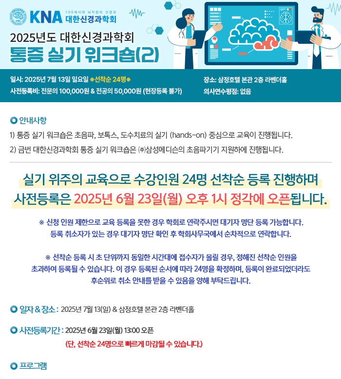 국내 2025년 대한신경과학회 통증 실기 워크숍 (2) 일자 : 07.13 (일) 장소 : 삼정호텔 본관 2F 라벤더홀 Homepage : https://cme.neuro.or.kr/education/edu_view.php?number=266 목록